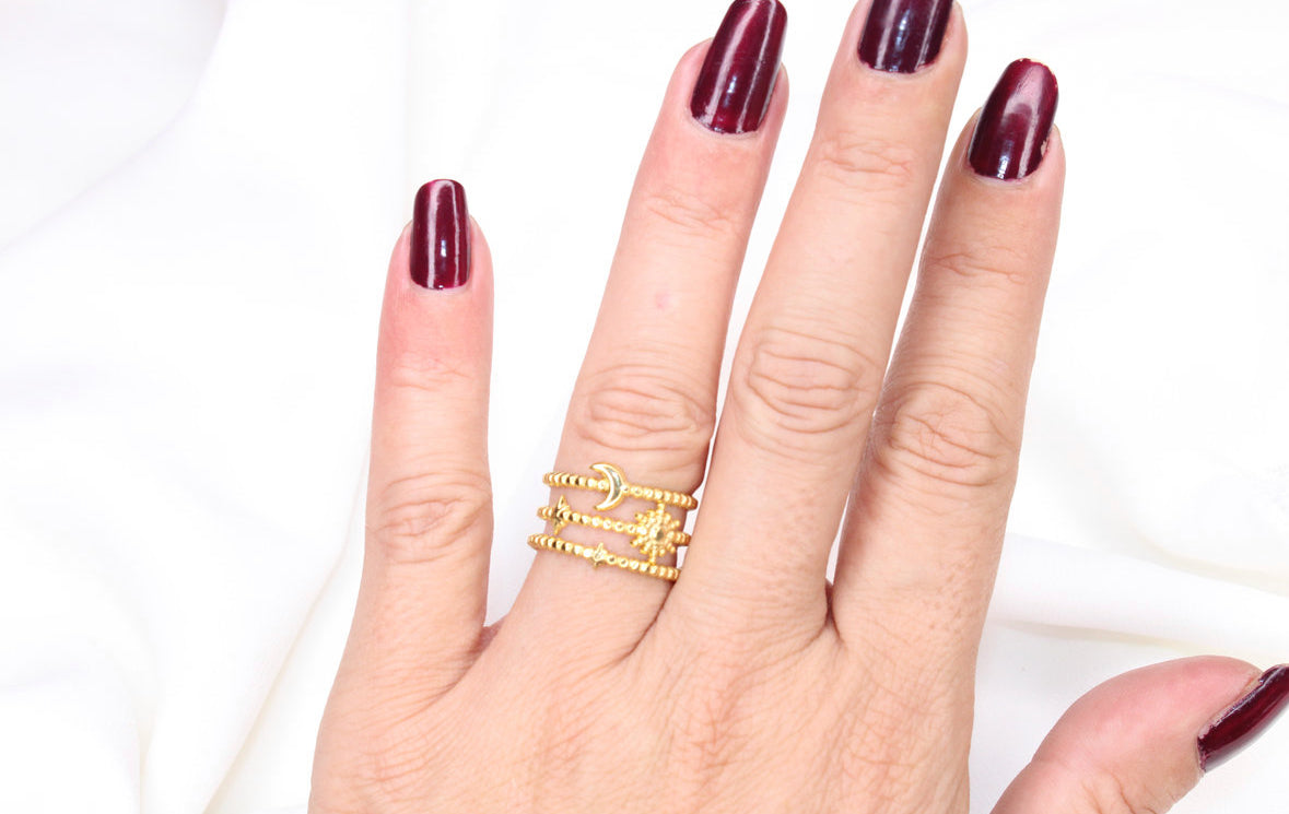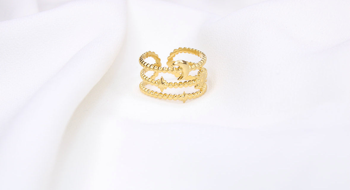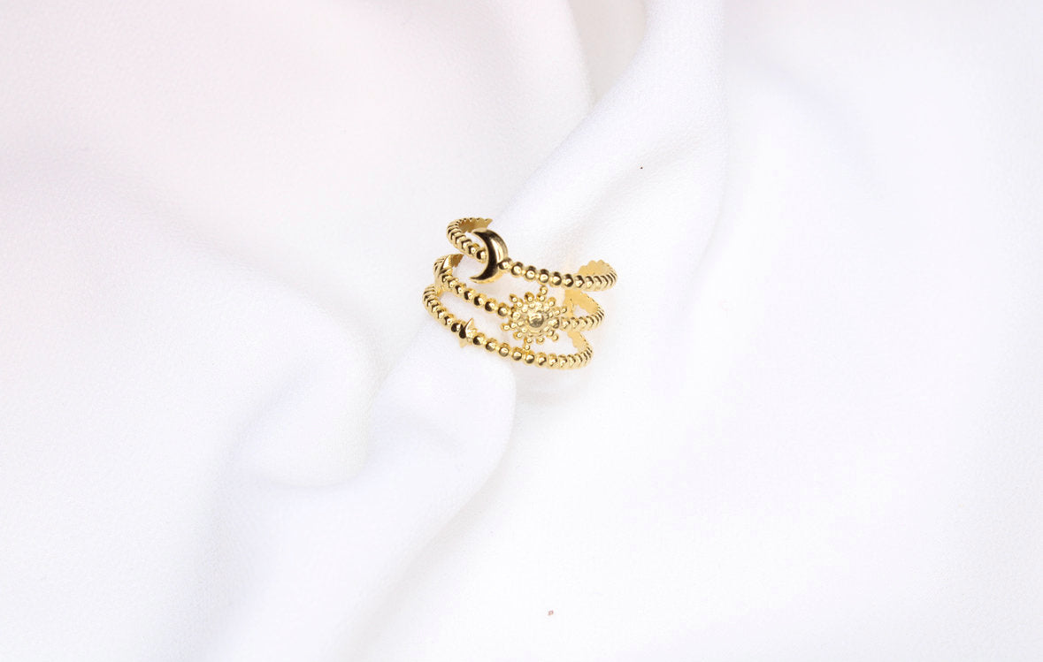 La bague KIM se distingue par son design raffiné à trois rangées, délicatement ornées d’une lune et d’une étoile. Son allure élégante et lumineuse apporte une touche céleste et poétique au doigt. Réglable, elle s’adapte à toutes les tailles pour un confort optimal tout en restant chic.