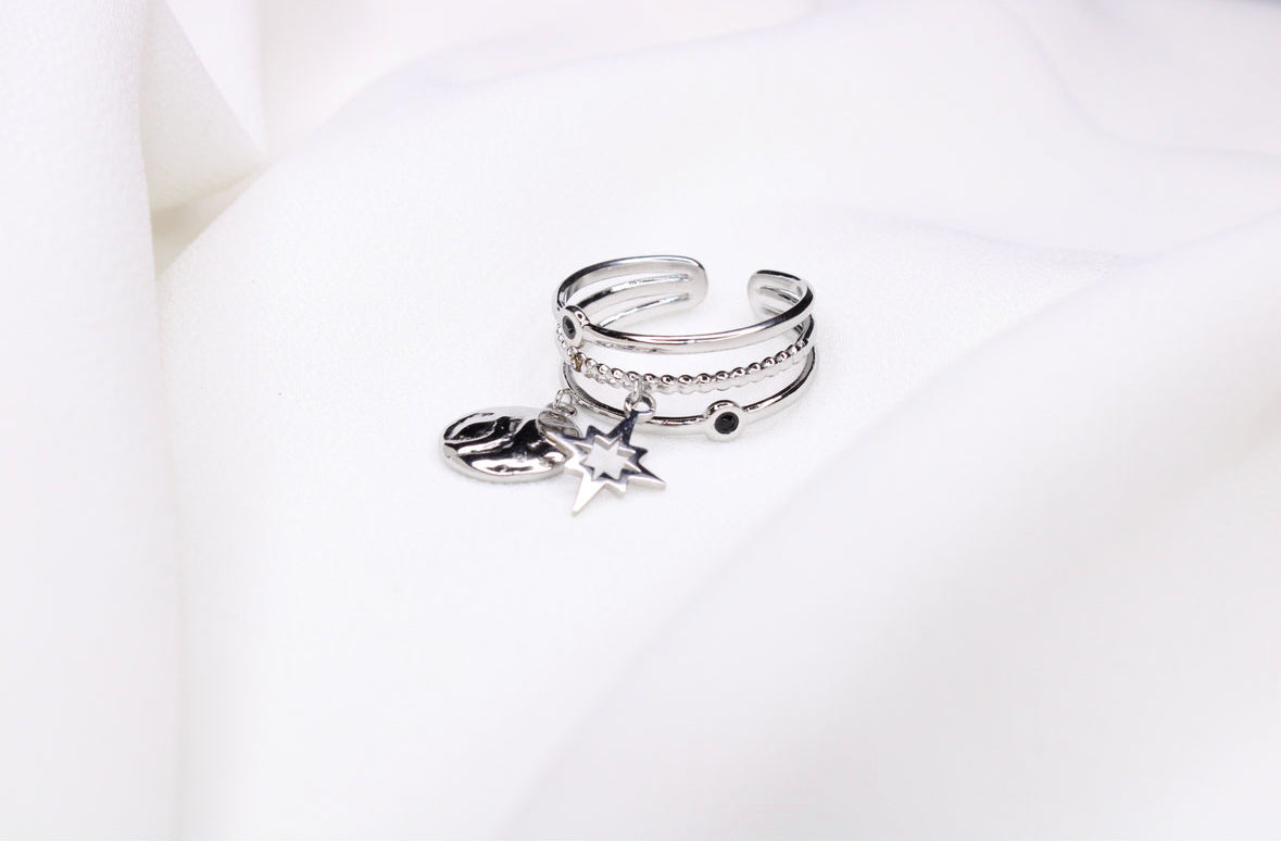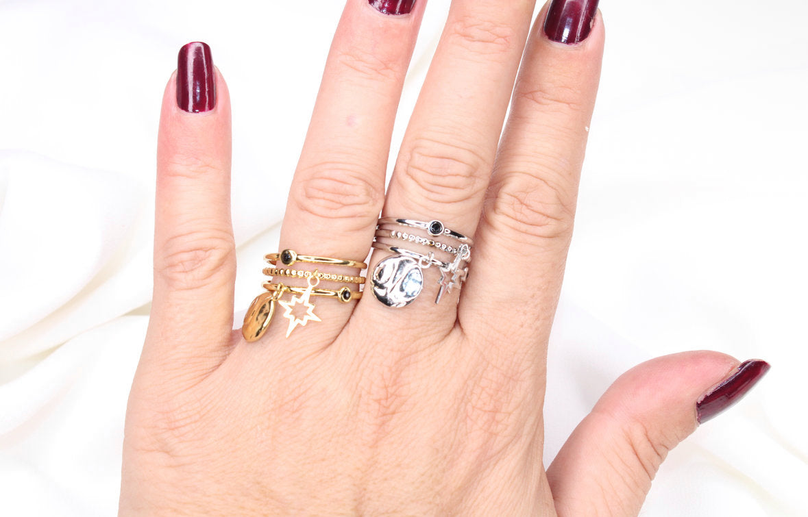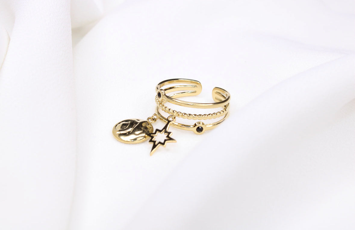La bague LÉA se distingue par son design élégant à trois rangées, sublimé par deux pampilles délicates : un rond plat et une étoile scintillante. Son allure féminine et raffinée apporte une touche de charme et de légèreté au doigt. Réglable, elle s’adapte à toutes les tailles pour un confort parfait.