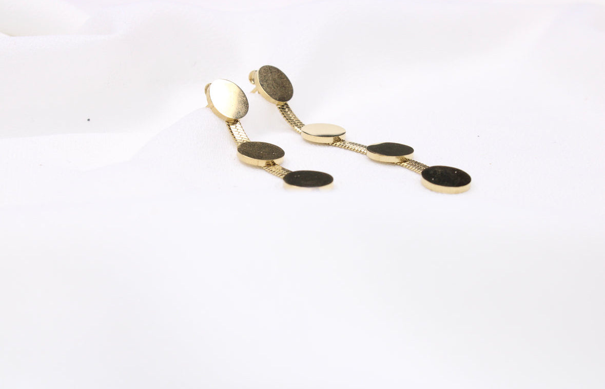 Les boucles d’oreilles MYA offrent une silhouette longue et raffinée, composée de quatre disques délicatement enchaînés. Leur mouvement fluide crée une ligne verticale élégante qui allonge le port de tête et attire subtilement la lumière.