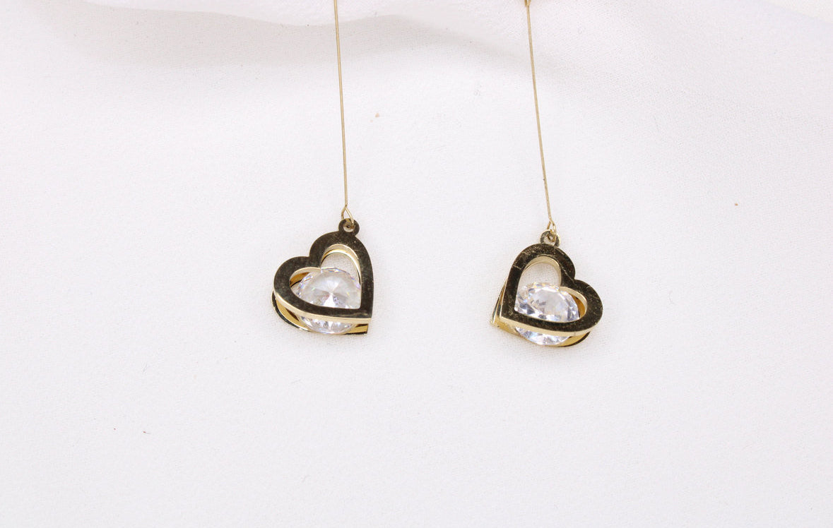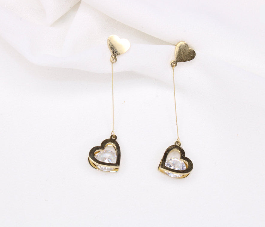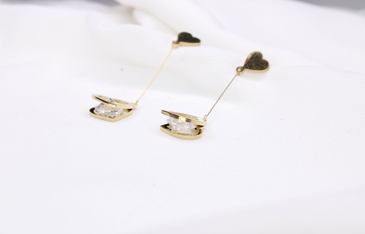 Elles se composent d’un cœur doré minimaliste en haut, prolongé par une tige fine et élégante. Au bout, un second cœur ajouré orné de strass brillants capte délicatement la lumière à chaque mouvement.